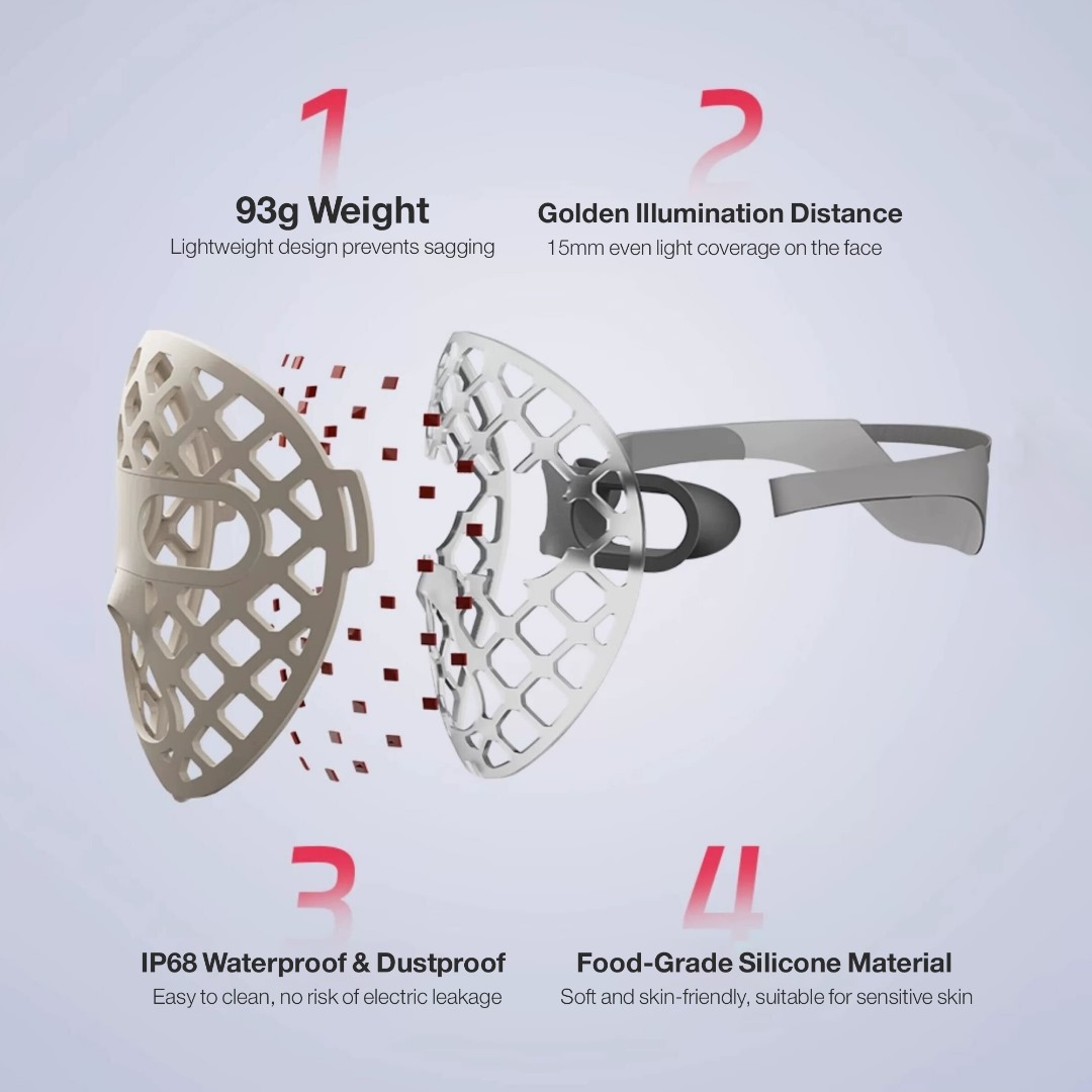 Its suspended structure, supported by eye pads, keeps the mask approximately 15mm away from your skin, allowing the LED light to distribute evenly while maintaining natural airflow for comfortable breathing.